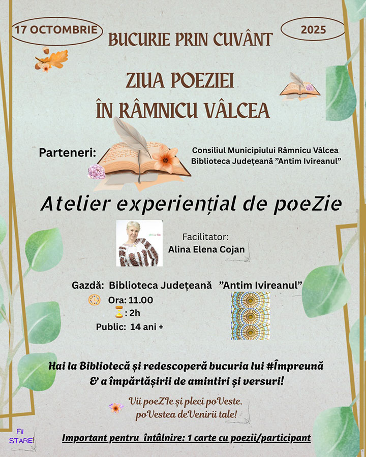 Bucurie prin cuvânt – ziua poeziei în Râmnicu Vâlcea. Atelier experimental de poezie